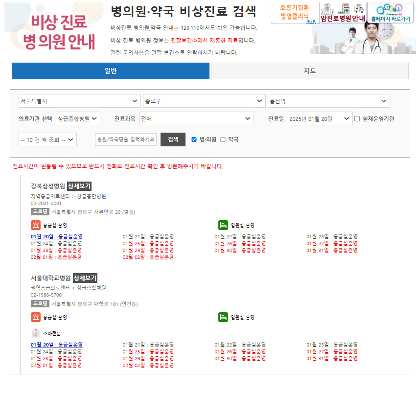밤에 갑자기 아이가 아플 때 소아진료 가능한 병원 찾는 사이트로 활용하셔도 좋습니다.