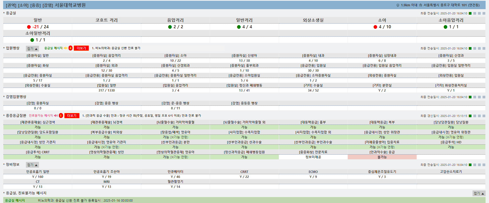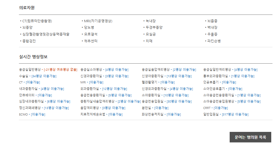 격리 병상, 입원병상, 중증응급질환 받아줄 수 있는지, 장비 어떤 것 사용가능한지 알 수 있습니다.
