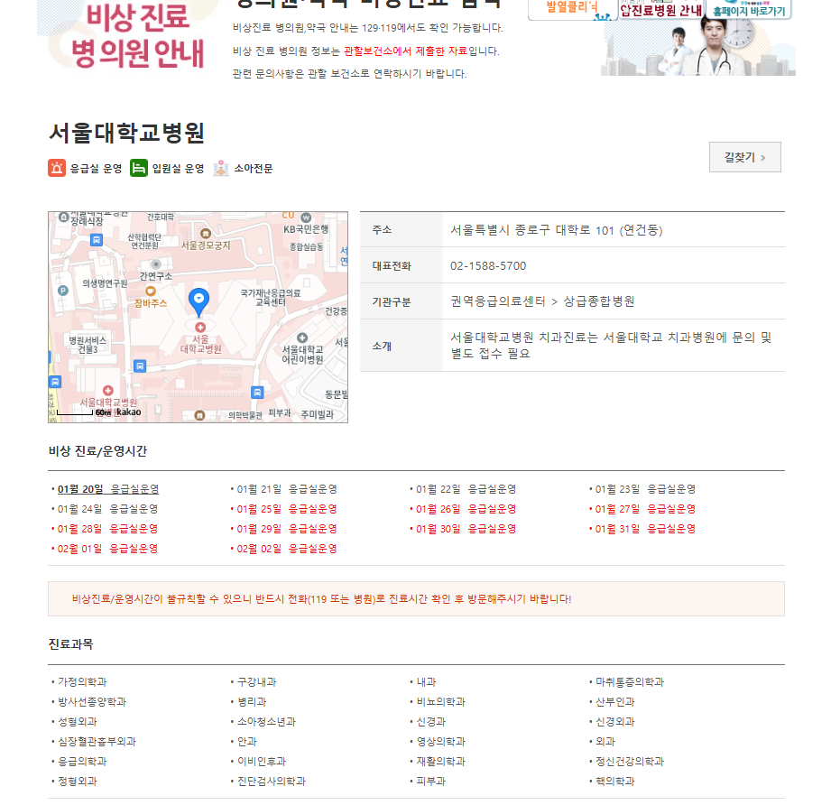 병의원, 약국 비상진료 검색을 위해 관할보건소가 제출한 자료를 중앙응급의료센터에서 제공하는 사이트인데,